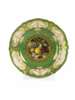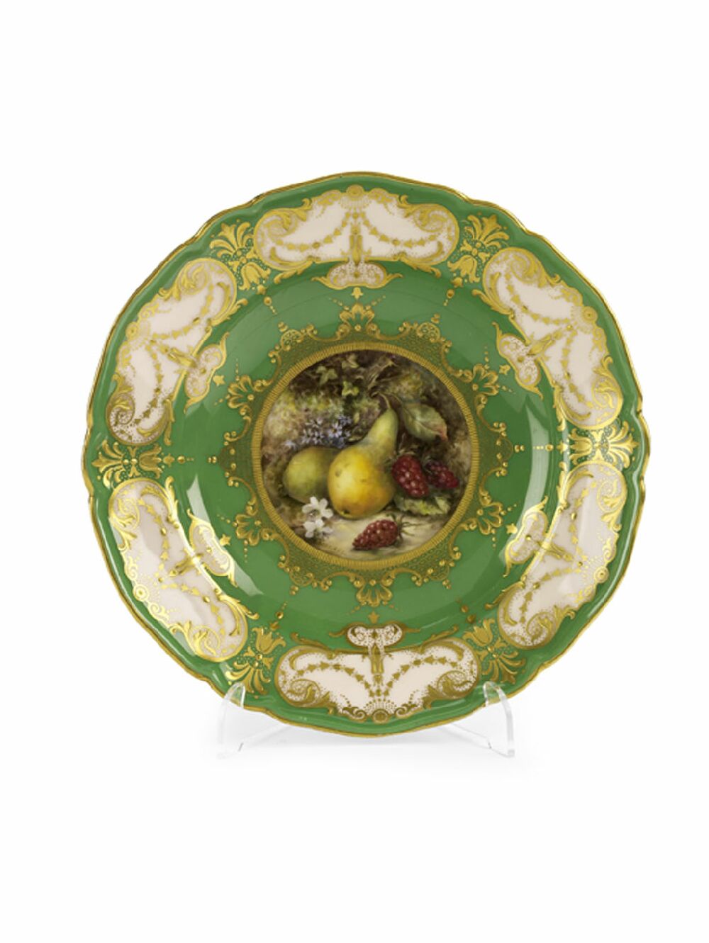 the border decorated with peach cartouches reserved on a green ground with gilt scrolling decoration, the well painted with pears, raspberries and blossom, puce printed mark, T. Goode & Co retailer's mark, date code for 1915, signed