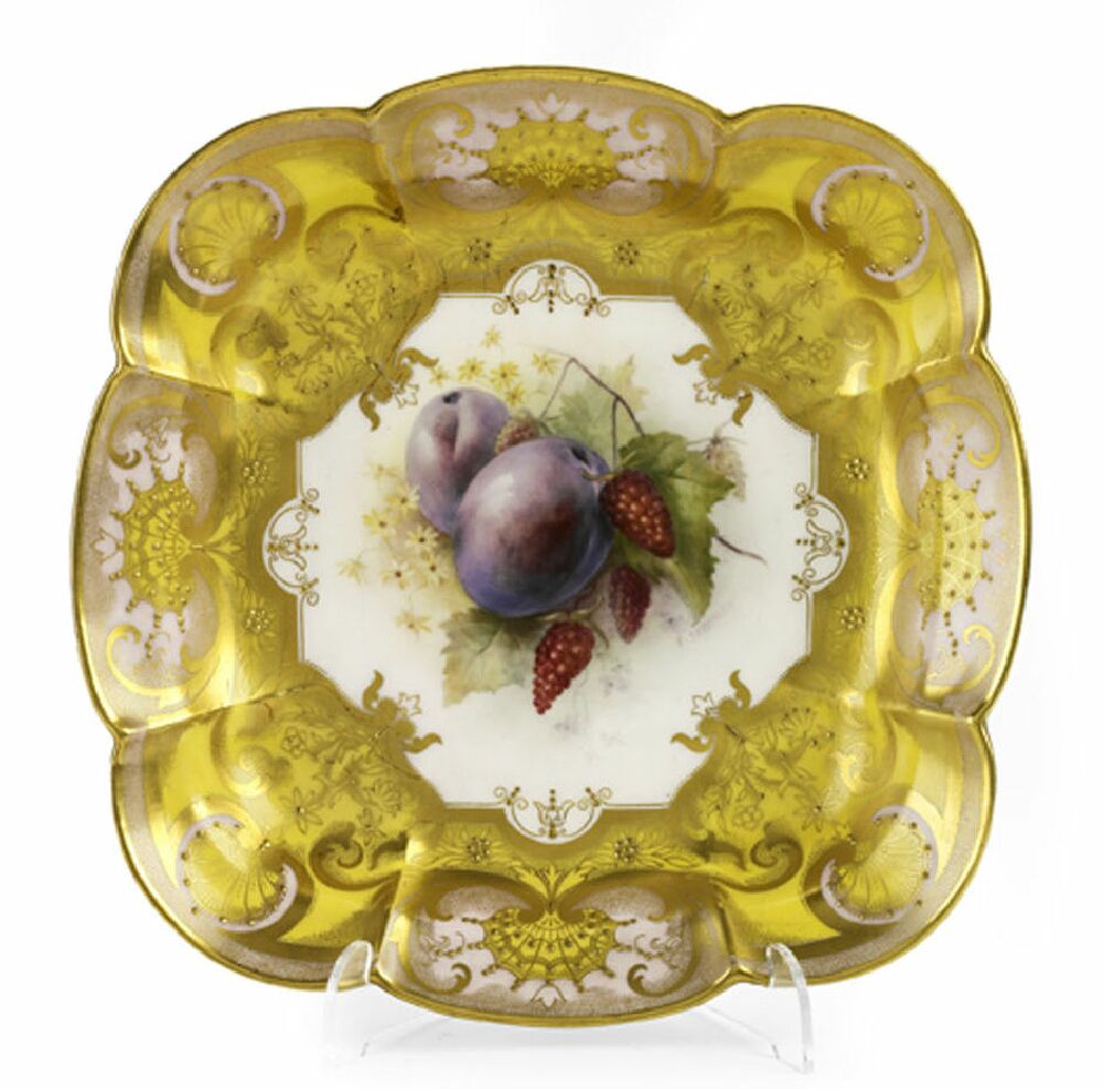 the border decorated with gilt shells, stylised flowers and foliage reserved on a yellow and pale pink ground, the well decorated with plums, raspberries and blossom, puce painted mark, date code for 1917, signed