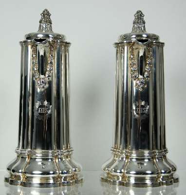 unmarked, the tall fluted cylindrical bodies engraved IHS within linear star engraved cartouche, the V neck spout with acanthus borders and fluted C scroll handle on a spreading shaped circular base, the domed panelled lid with bud finial (2)