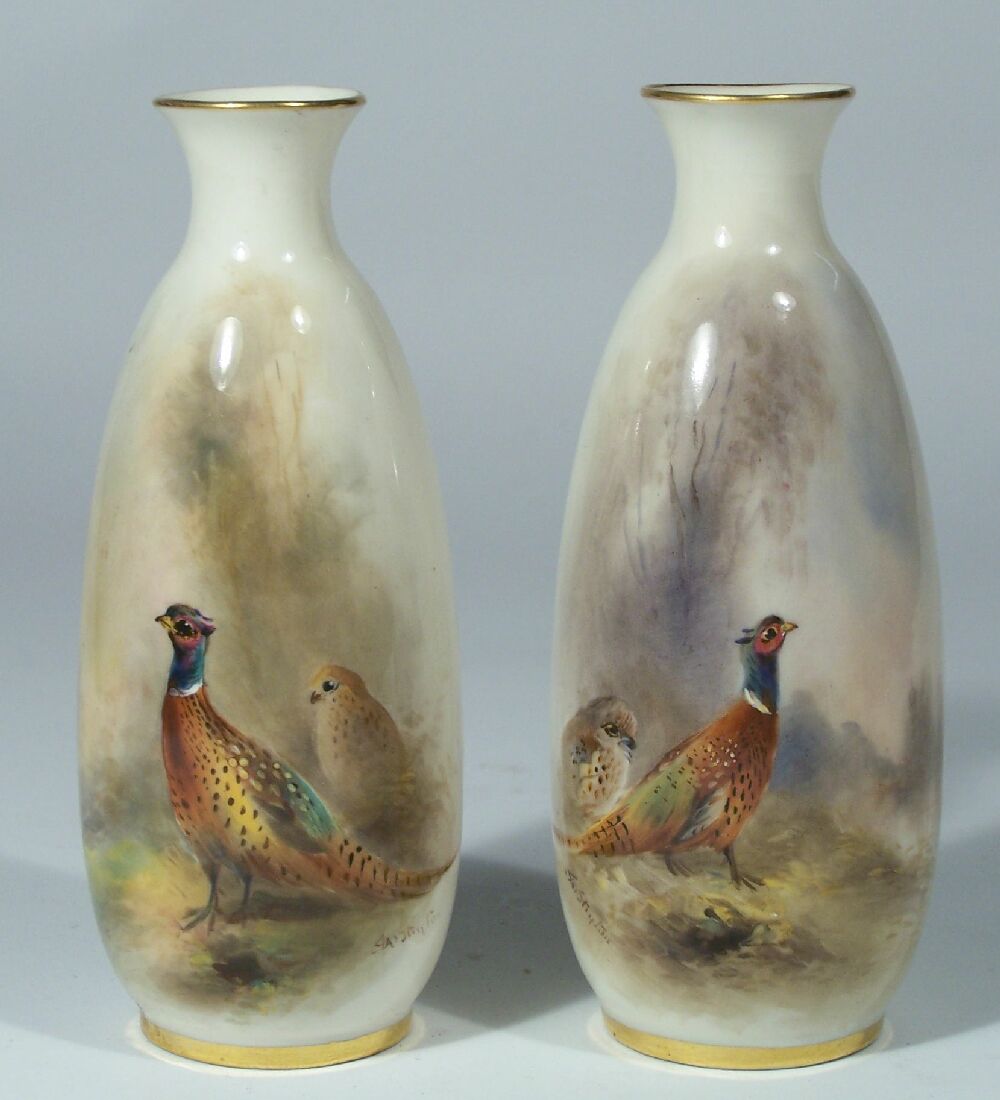 each with flared rim above ovoid body, decorated with a pair of pheasants in a landscape setting, puce printed mark, date code for 1919 (2)