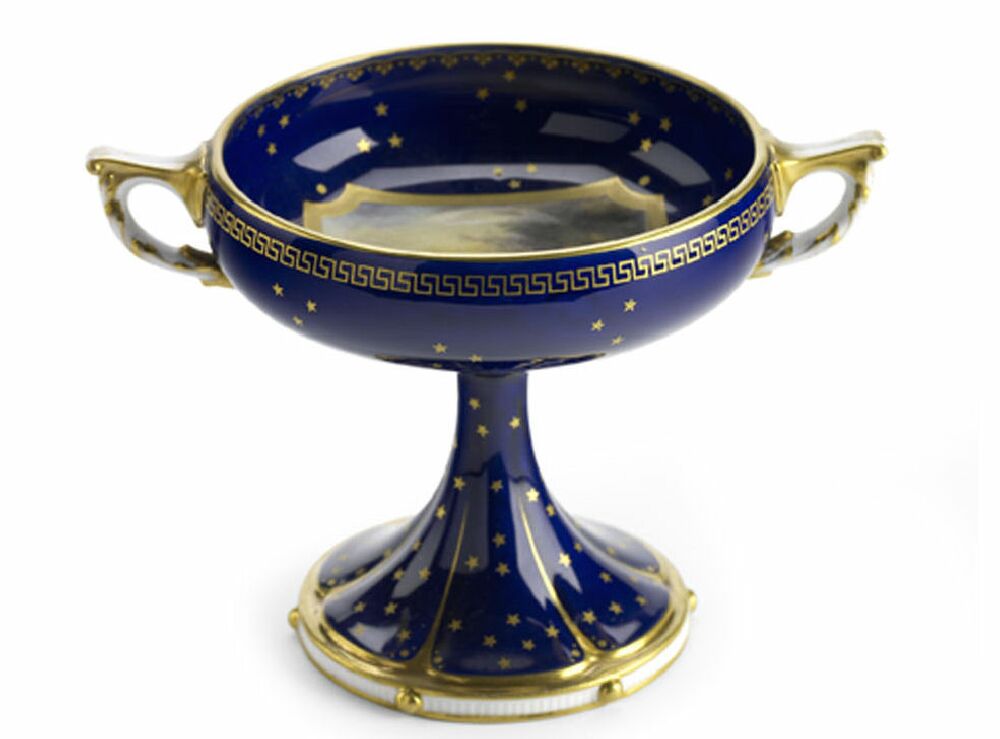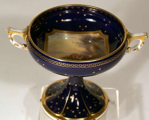 by Harry Stinton, decorated with gilt stars reserved on a dark blue ground, the bowl painted with a square panel of cows drinking at a river, raised on a spreading circular foot rim moulded stiff leaf collar, puce printed mark, date code for 1907