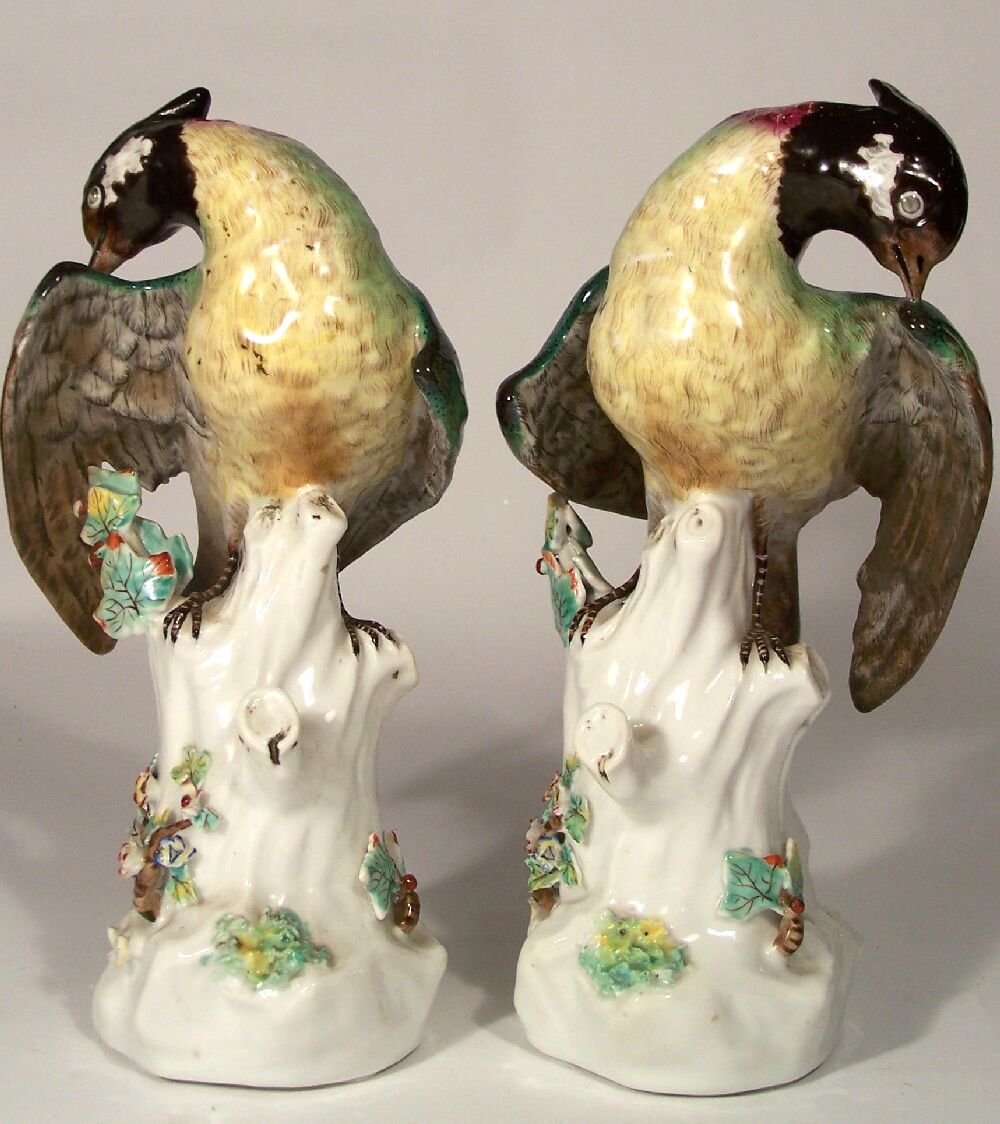 each with a crest, painted in pink, green and yellow and perched on a flower and leaf encrusted branch