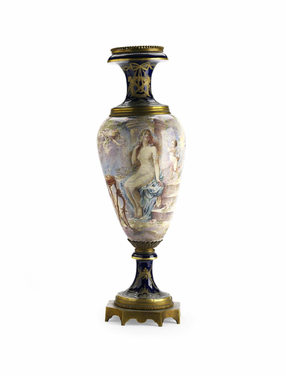 of elongated baluster form, the body decorated with a continuous classical scene, the neck and socle decorated with gilt trophies and scrolls