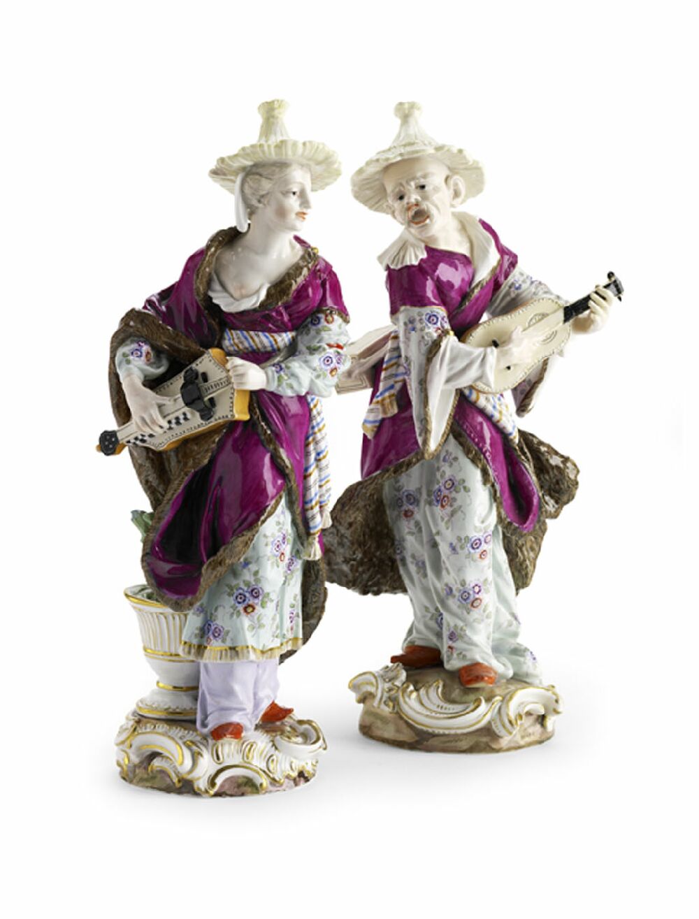 the man dressed in pink coat and floral robe playing a guitar, the woman similarly attired and playing the hurdy-gurdy, each on a rococo scroll base, blue painted crossed sword mark (2)