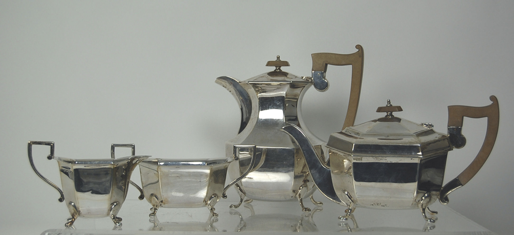 comprising coffee pot, teapot, twin handled sugar bowl and milk jug, of canted rectangular outline with panelled body, raised on four simple hoof feet (4)