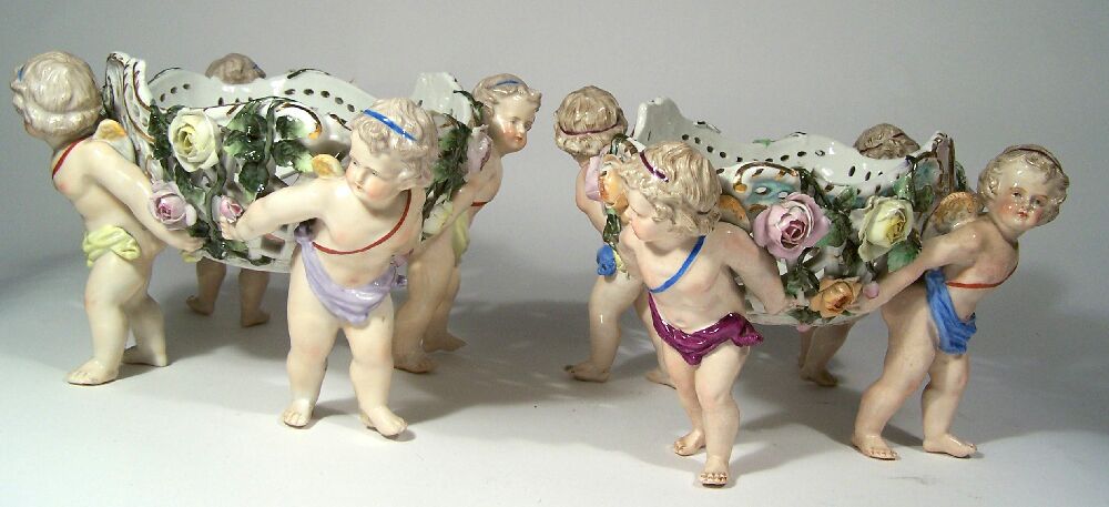 each of pierced scalloped oval form, encrusted with flowers and supported by four winged cherubs (restorations); and another similar, supported by two cherubs (3)