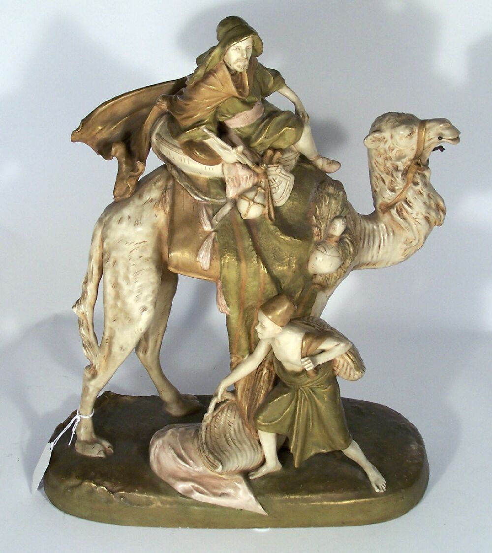 of a man riding a camel with an attendant by his side, applied pink triangle mark