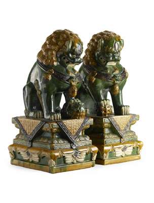 one with its paw raised on a cub, the other with its paw raised on a globe, each on a swagged rectangular plinth, in yellow and green glazes