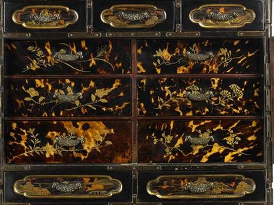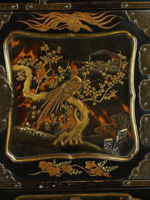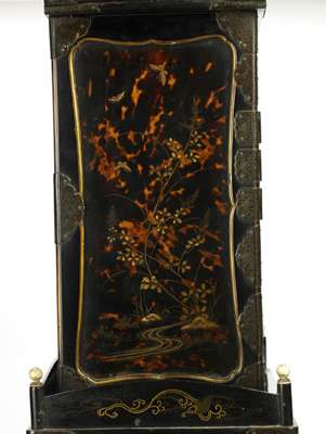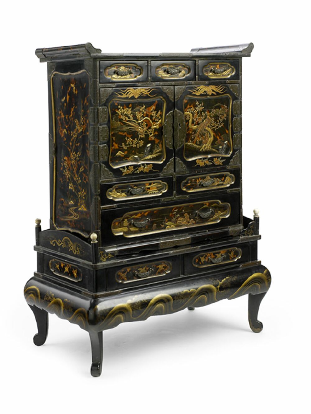 of freestanding form, decorated with lacquer work floral, bud and landscape panels on tortoiseshell ground, with foliate chased metal mounts, three drawers above two cupboard doors enclosing six drawers and three further drawers, the stand with two drawers on cabriole legs