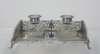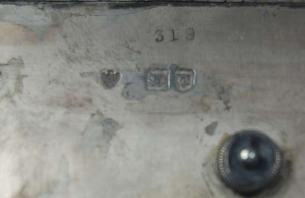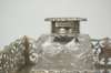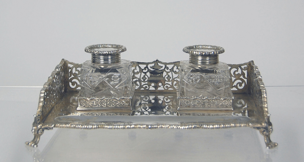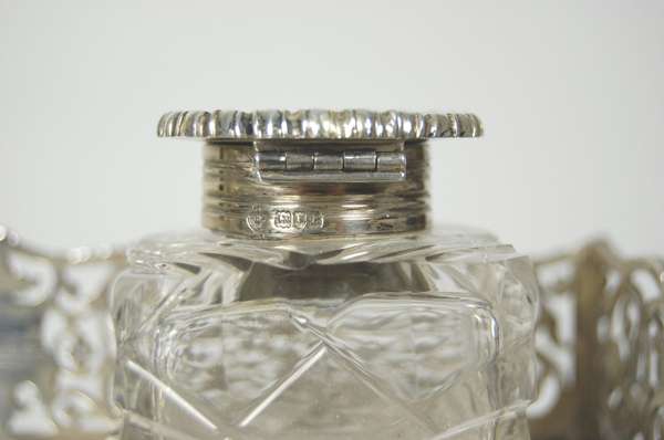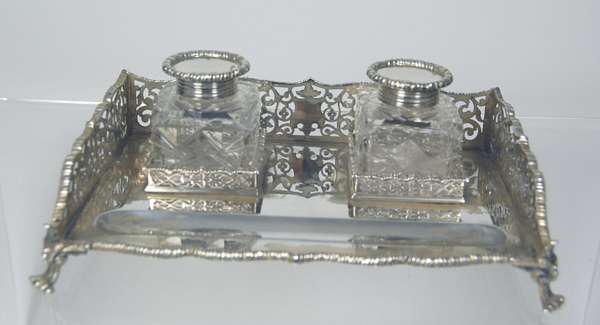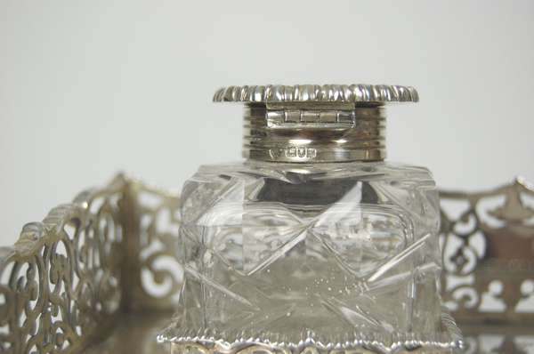 London 1902 the rectangular stand with pierced scroll gallery border and gadrooned rim, set with two cut glass square inkwells with simple circular gadrooned rim pull off covers and with pen tray to front