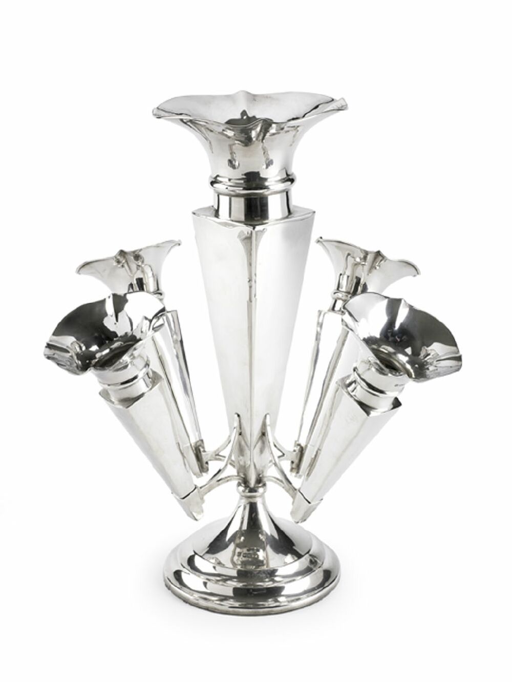 the central vase of tapered square outline with large everted scalloped rim, with four branchs on angular supports of similar form, on a large spreading stepped domed foot rim