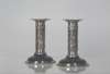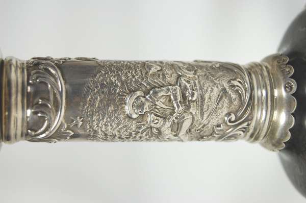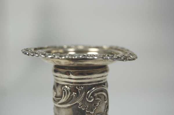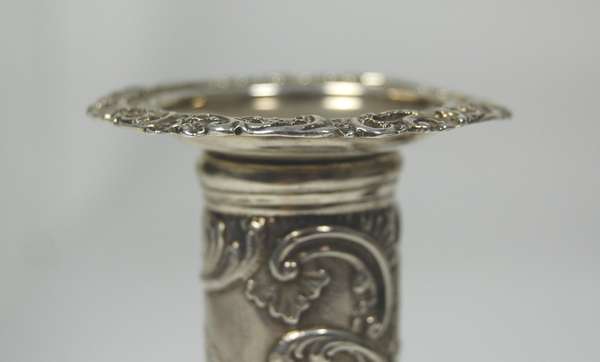 the cylindrical columns with embossed pastoral scene, the sconces and foot rim with pierced foliate scroll border, the whole resting on a circular domed tortoieshell foot