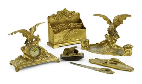 all pieces signed 'A. Marionnet,' and each piece with an eagle, to include: a two division stepped letter rack; a blotter with eagle handle; a letter knife; a pen tray; a stand with large eagle and twin ink wells, 38cm wide; and an eagle mounted clock inset in a naturalistic rocky base with scroll feet, 29cm wide (6)
