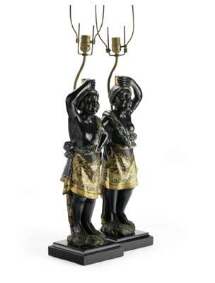 now adapted as lamp bases, with headresses and colourful floral and arabesque robes, standing on rocky bases with later stepped plinths, with canted square shades (2)