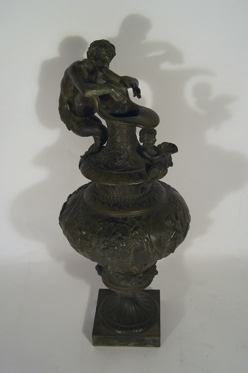 with foliate and leaf scroll decoration throughout, the top with a triton and a sea nymph holding a conch shell above classical scenes and foliate garlands, on a fluted spreading foot with plinth base