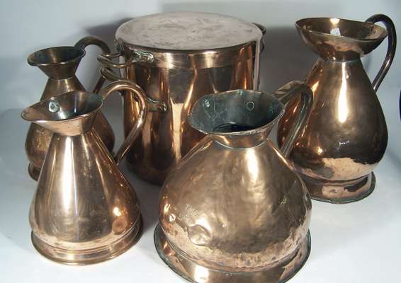 to include: a colander; a jam pan; four bellied measures; two of 2 gallon size; two of 1 gallon size; a lidded handled large pot, 35cm high; and a copper and wrought iron bowl warming stand, 76cm wide (8)