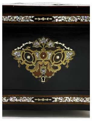A late 19th century French ebonised, kingwood banded and mother of pearl licquer box