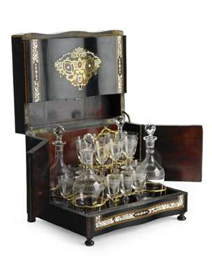 of rectangular serpentine outline, the hinged lid inlaid with stylised silver metal mounts and a central oval, the lid and sides opening to reveal four decanters with stoppers and sixteen etched glasses within a gilt metal stand, on bun feet