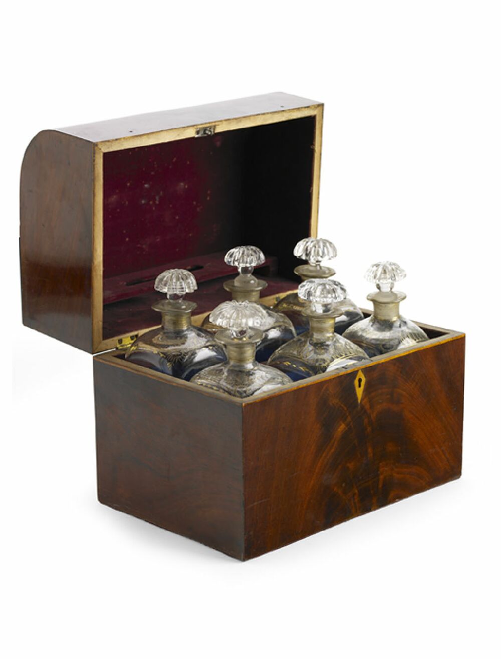 with strung edges and ebonised mouldings, the hinged lid revealing a lined divided interior with six gilt painted decanters, lobed stoppers mainly associated, with key
