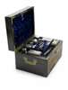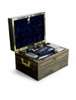 inside of lid with a cracked mirror and document folder, opening to reveal an interior with six silver and silver metal lidded boxes to the rear and a removeable tray to the front with a lined implements tray and three chased silver lidded glass boxes, hallmarked for London, above a storage space, the sides with countersunk handles and a now locked lateral drawer, key lacking, this lot includes three associated razors, brass plaque to rear inscribed 'W. LEUCHARS MAKERS TO THE QUEEN 33 PICCCADILLY LONDON'