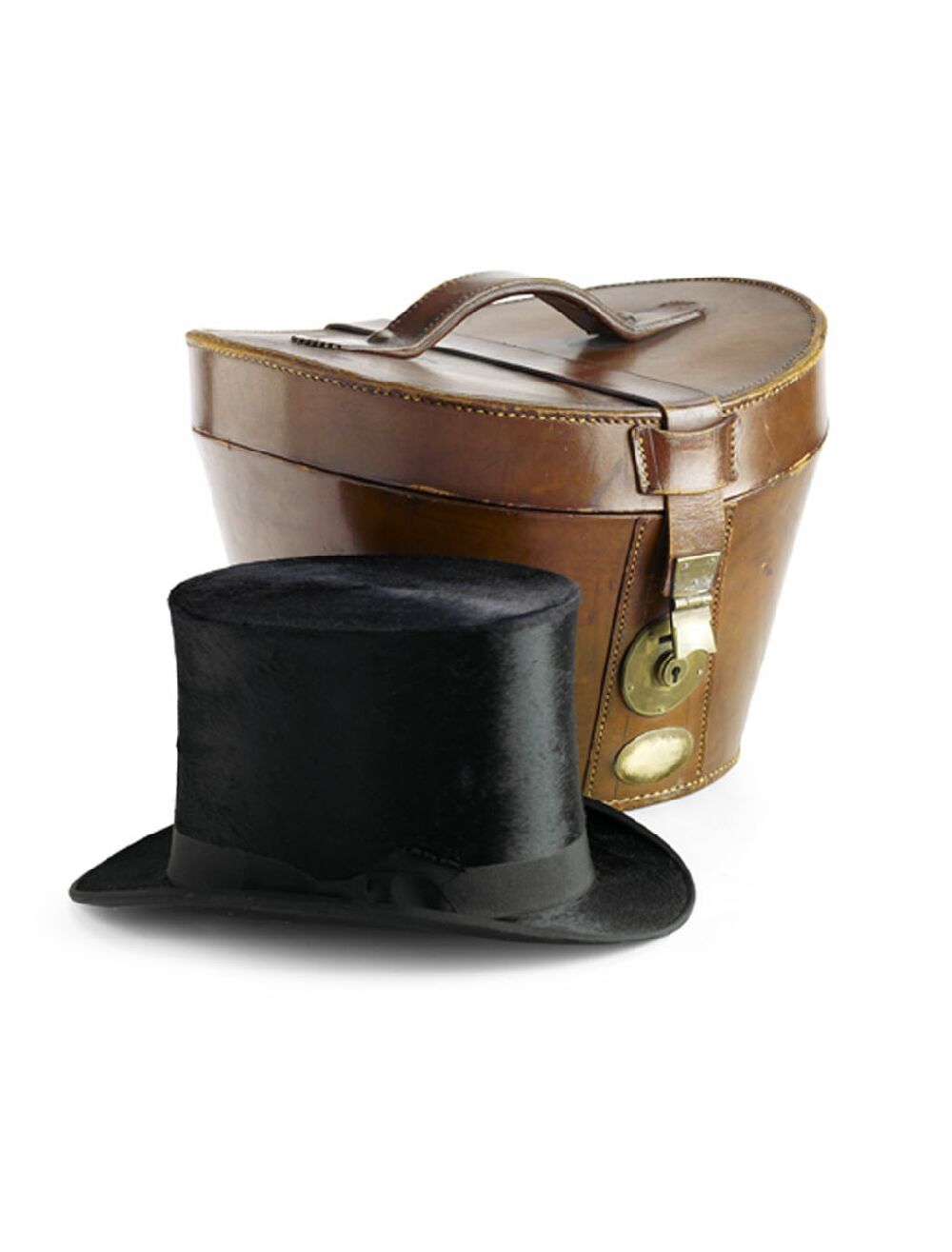 of typical concave form, bears label for 'Hope Brothers Ltd. Ludgate Hill, London', 36cm wide; together with two black felt top hats, 35cm wide; and a Victorian period black leather and brass mounted bag (4)