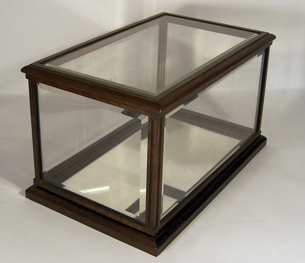 the bevelled glass panels in a rosewood moulded frame, with a mirror glass floor and moulded plinth base