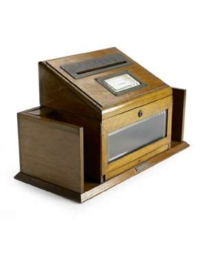 of canted form, the central hinging lid with brass letter aperture and glazed 'Post Leaves' section, above a bevelled glazed panel and a narrow pull out tray and brass 'Telegrams' plaque, sides with space for letters