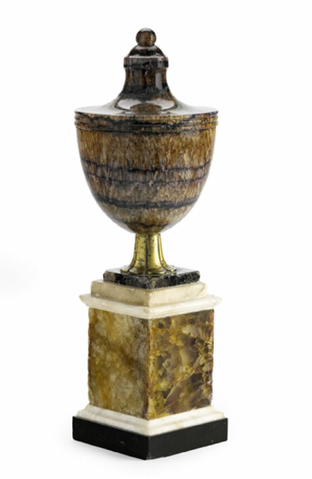 the separate section lid with a finial and moulded edge and on a brass foot, the square stepped pedestal with white marble mouldings and black marble base (old repair to knop)