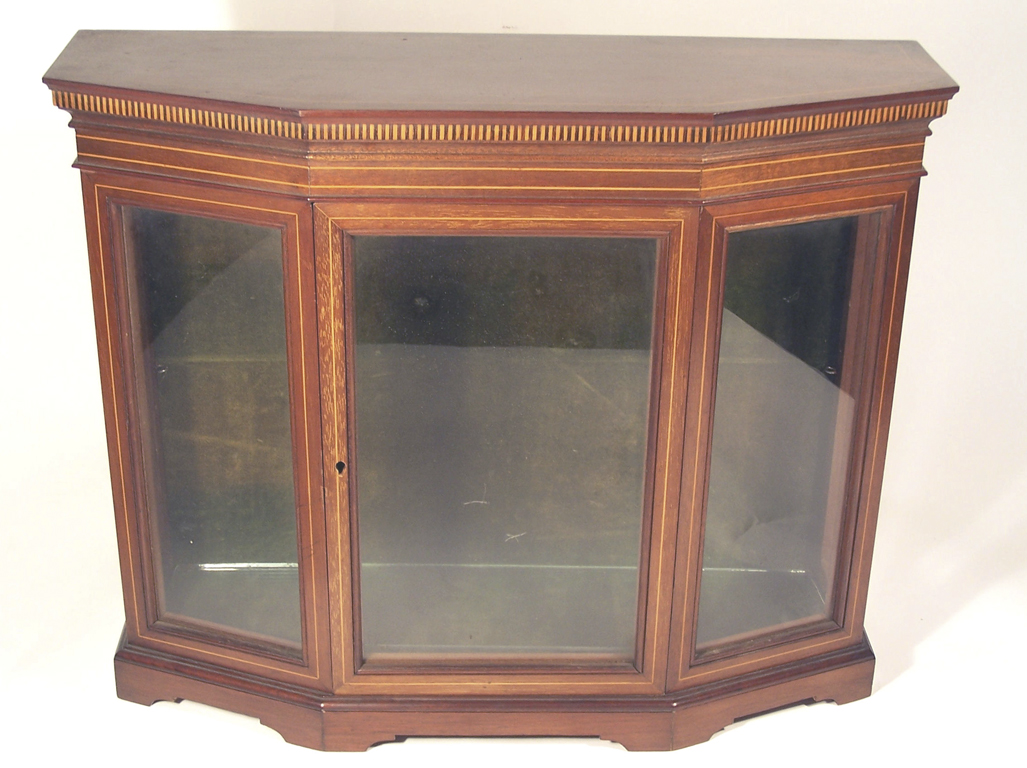 inlaid with stringing and chequer banding, of canted breakfront glazed form, the lined interior with a glass shelf, on shaped bracket feet