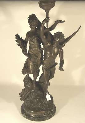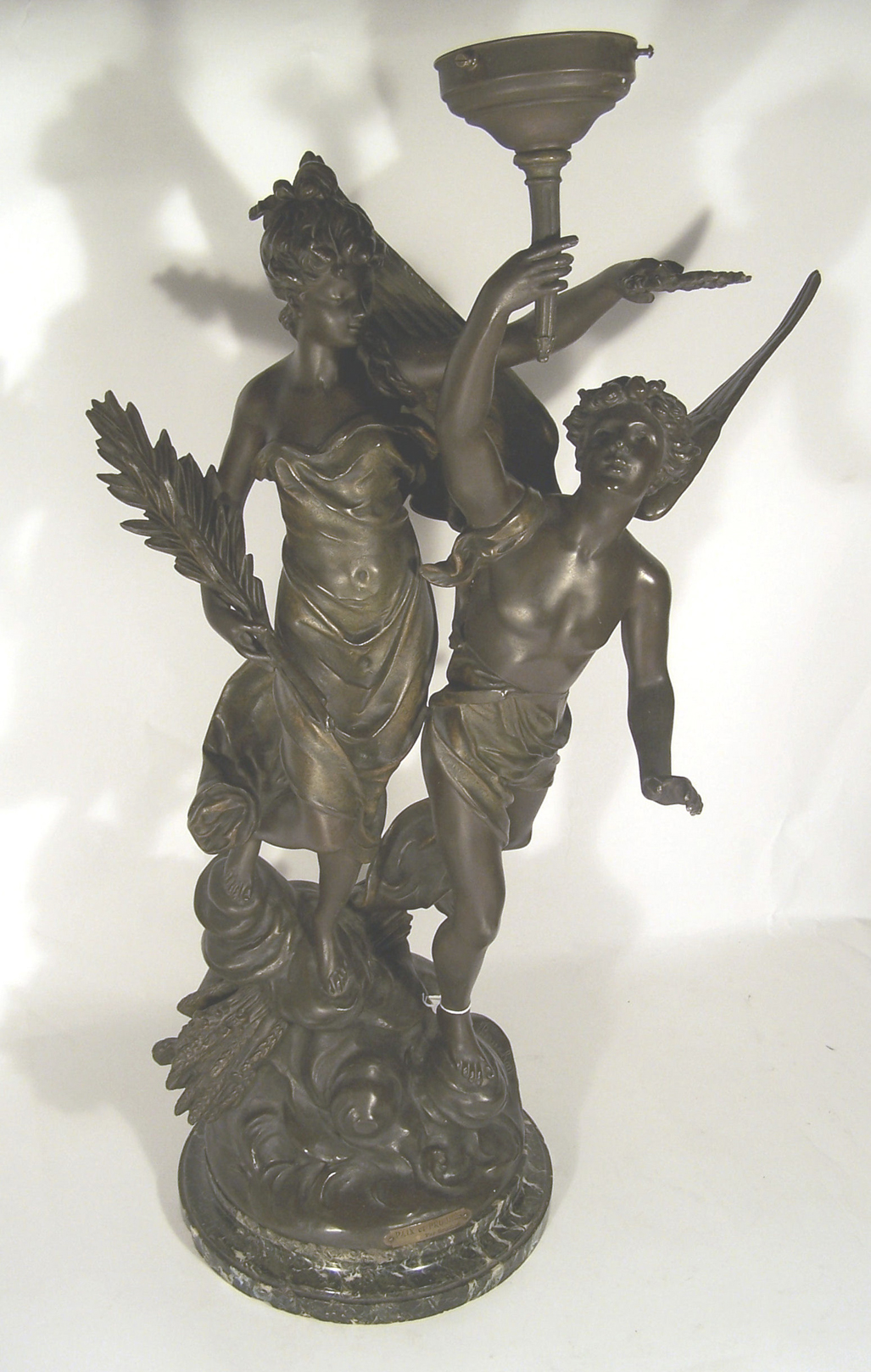 entitled 'Paise et Progres par Bruchon' the winged boy figure holding a torch, the female figure on wreath above his head, on a moulded marble base signed, 'Bruchon' (drilled for electricity)