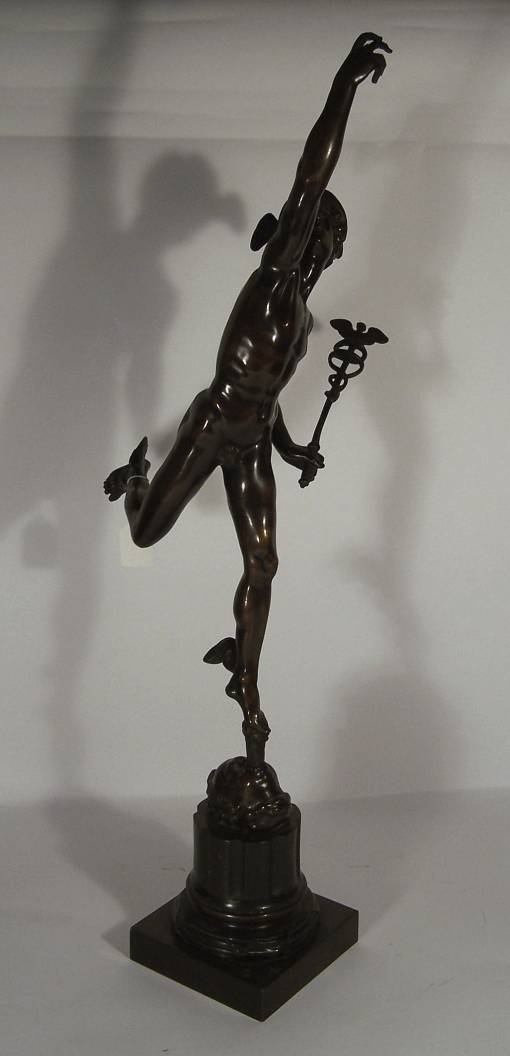 in typical after the Antique footed posture and holding a sceptre, on a fluted socle and square plinth base