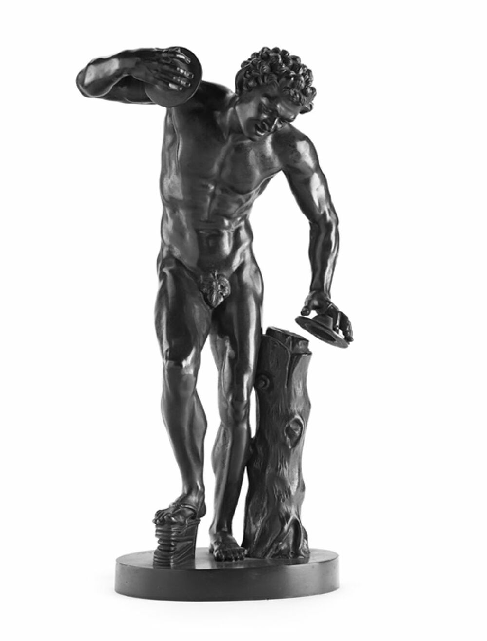 of a cymbal playing satyr, stood next to a tree stump and on an oval base, base signed, 'Duchemin'