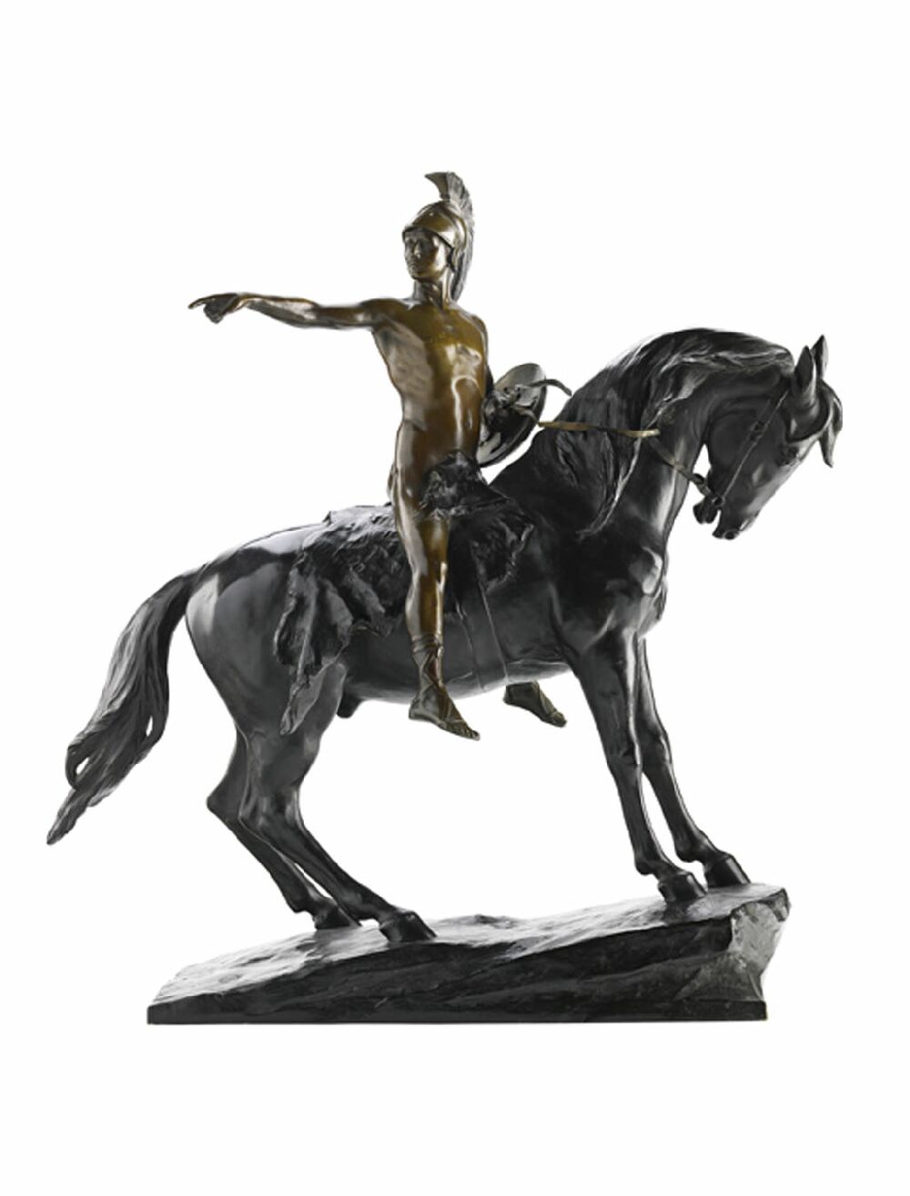 of Grecian warrior with shield seated on horseback, pointing into the distance with right hand, base signed, 'Schmidt - Felling 1904' and bears founders roundel for a foundry in Friedrichshagen