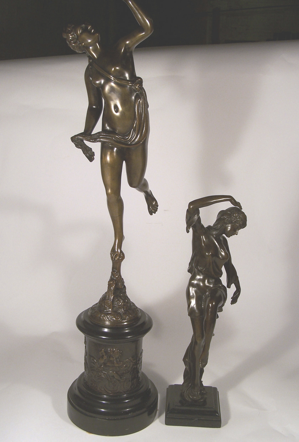 of Diana the huntress, standing blowing a horn on a naturalistic rocky base, on a black marble and bronze pedestal, horn lacking, 80cm high, together with an early 20th century bronze figure, of a dancing maiden, on a stepped block marble base, 46cm high (2)