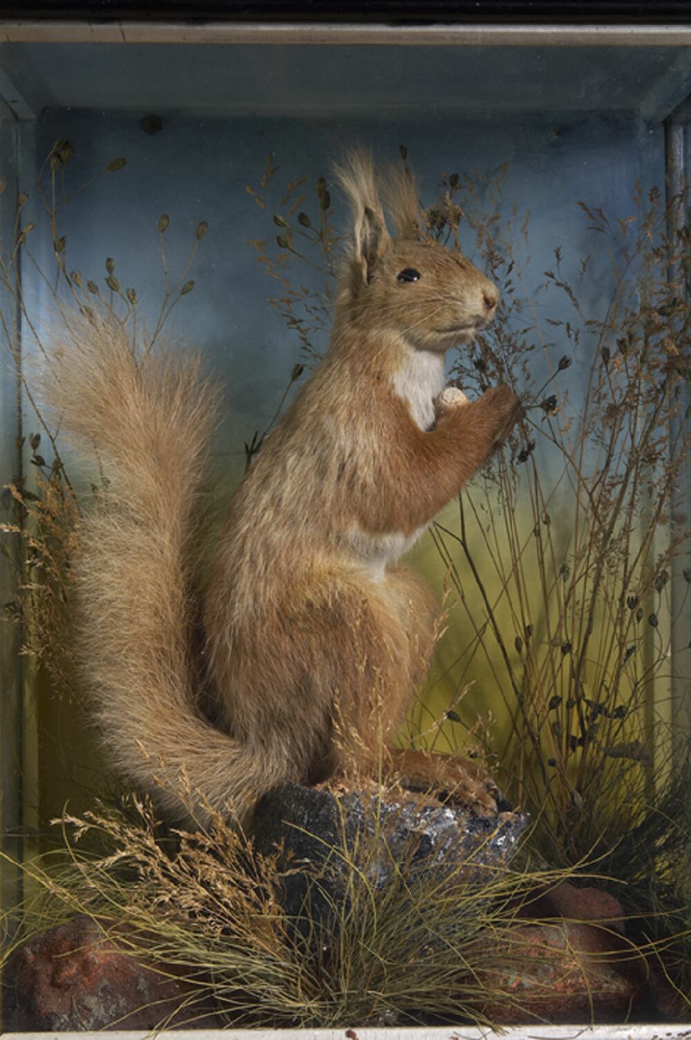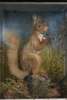 standing on a naturalistic tree stump holding a nut, within an ebonised glazed case