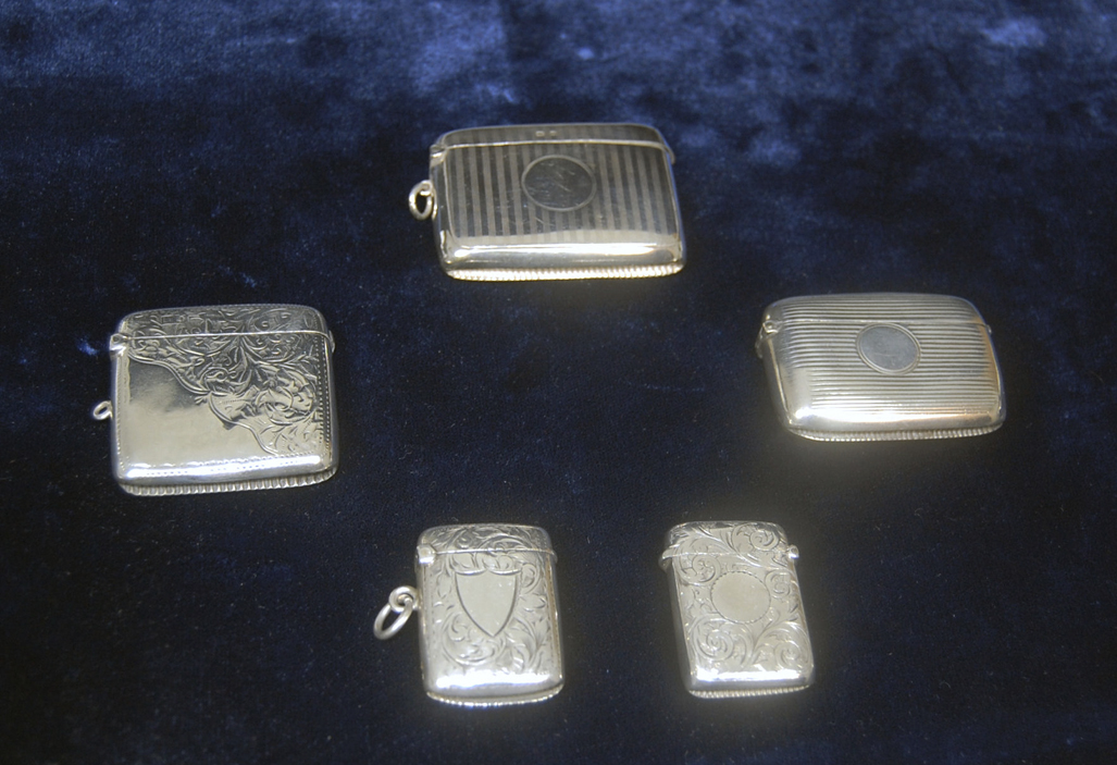 to include a reeded rectangular example, Birmingham 1921; a large rectangular example with linear engraved decoration and vacant circular cartouche Birmingham 1913; a large square example with foliate and scroll decoration, Chester 1905; and two smaller example both foliate engraved (5)