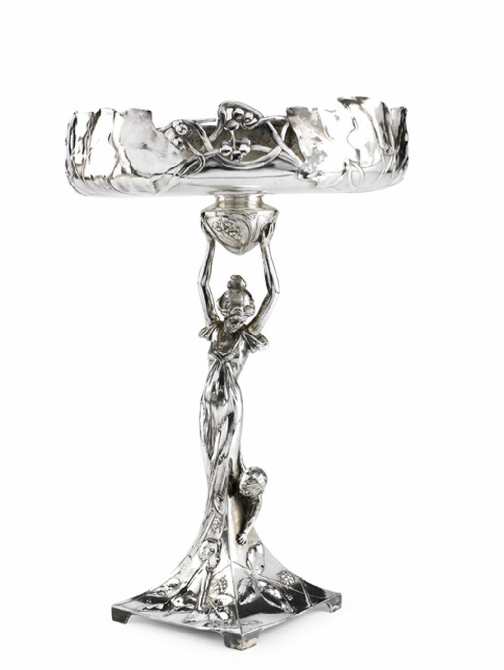 the circular dish formed from vine leafs and pierced fruiting vine, supported by a standing female figure with her hands aloft and a child at her feet, the spreading square base with fruiting vine and child design, on bracket feet