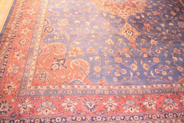 the blue field with a cusped floral medallions and pendants, within madder spandrels and main palmette border between floral bands