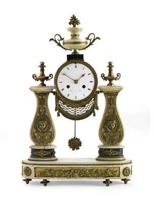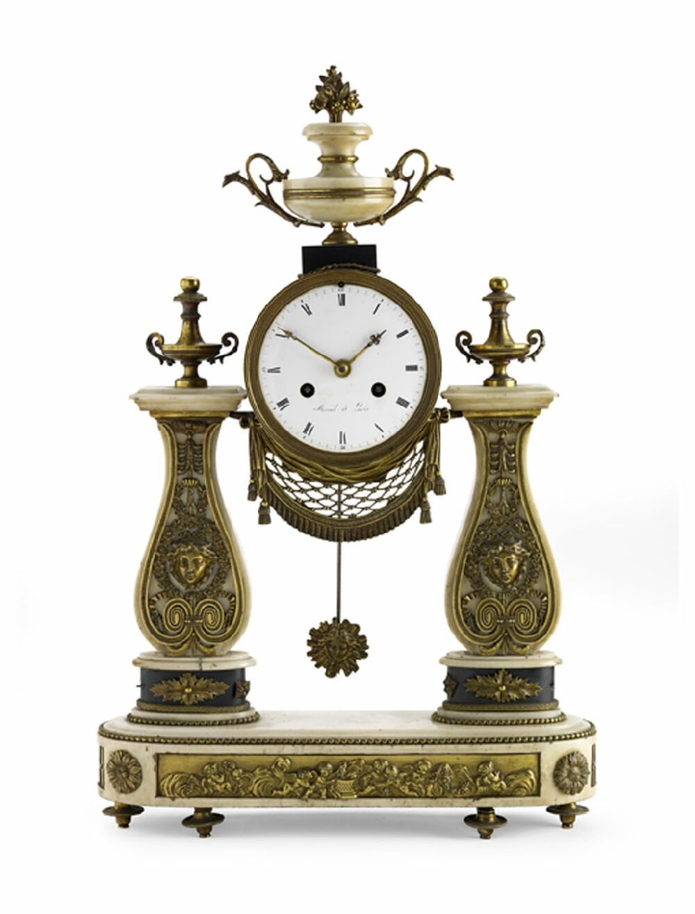 the 11 inch white marble marked 'Mesnil a Paris' with twin winding holes, with a twin train cylinder movement striking on a bell, the clock upheld on waisted supports with Bocchie mask and scroll mounts headed by urn finials, on a plinth base with a frolocking putti mount, on toupie feet