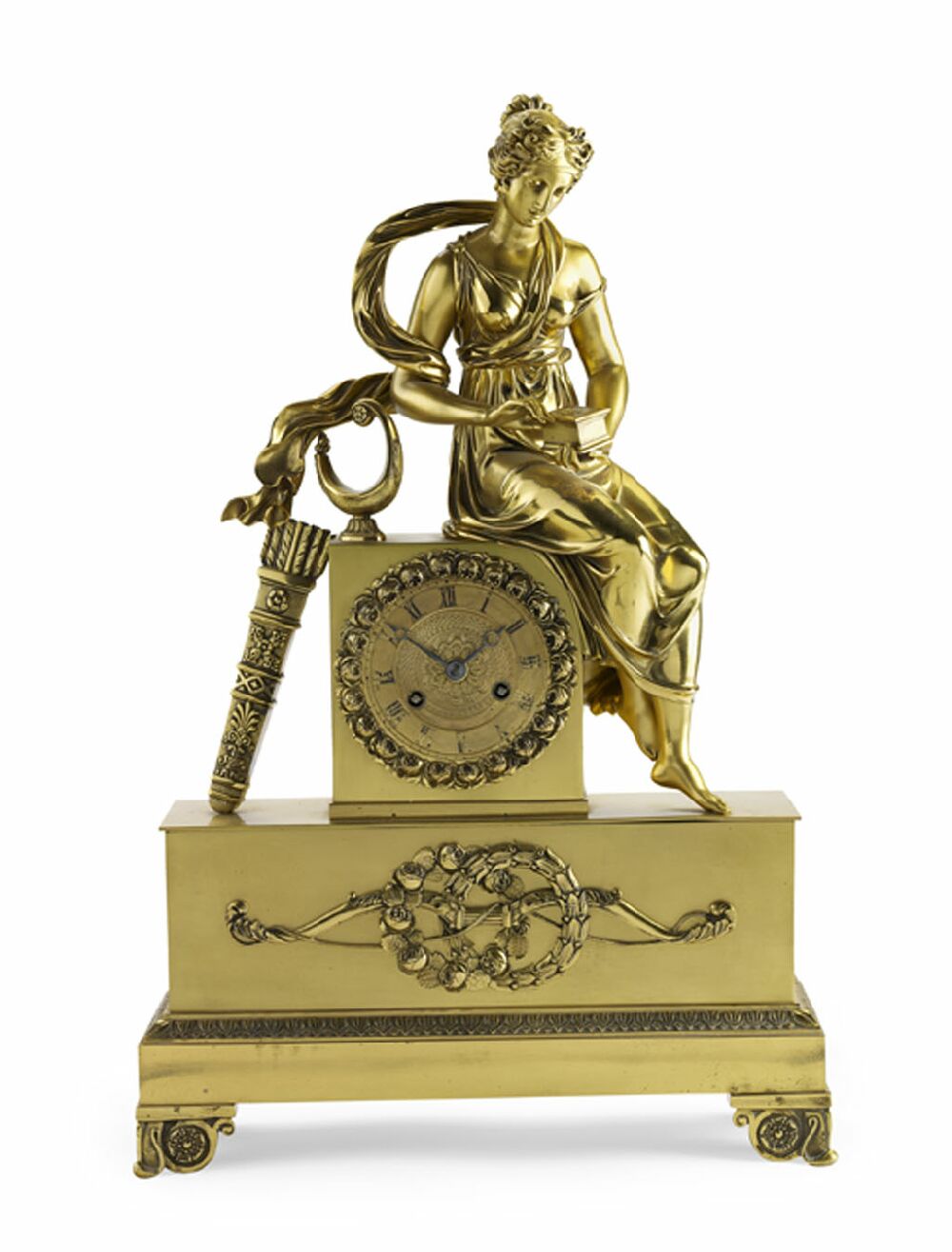 the 3 inch engine tuned dial with twin winding apertures, Roman numerals and an entwined rosehead mount, the twin train movement striking on a bell, the clock face housed within a pedestal with seated Greek maiden and her quiver, the stepped plinth with a bow and rosehead garland mount, raised on scroll and rosette feet