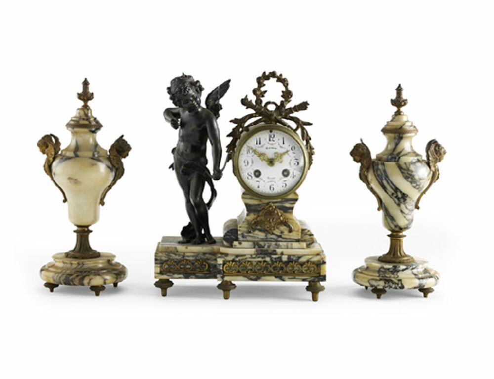 the 9 inch painted white enamel dial with twin winding apertures, ornate pierced gilt hands and marked 'MASSOT BAYONNE' the twin train movement striking on a bell, with a garland and trophy surmount and bronze cherub to one side, the plinth base with toupie feet, together with a pair of winged female term mounted urns on modelled circular bases (with winder and pendulum)