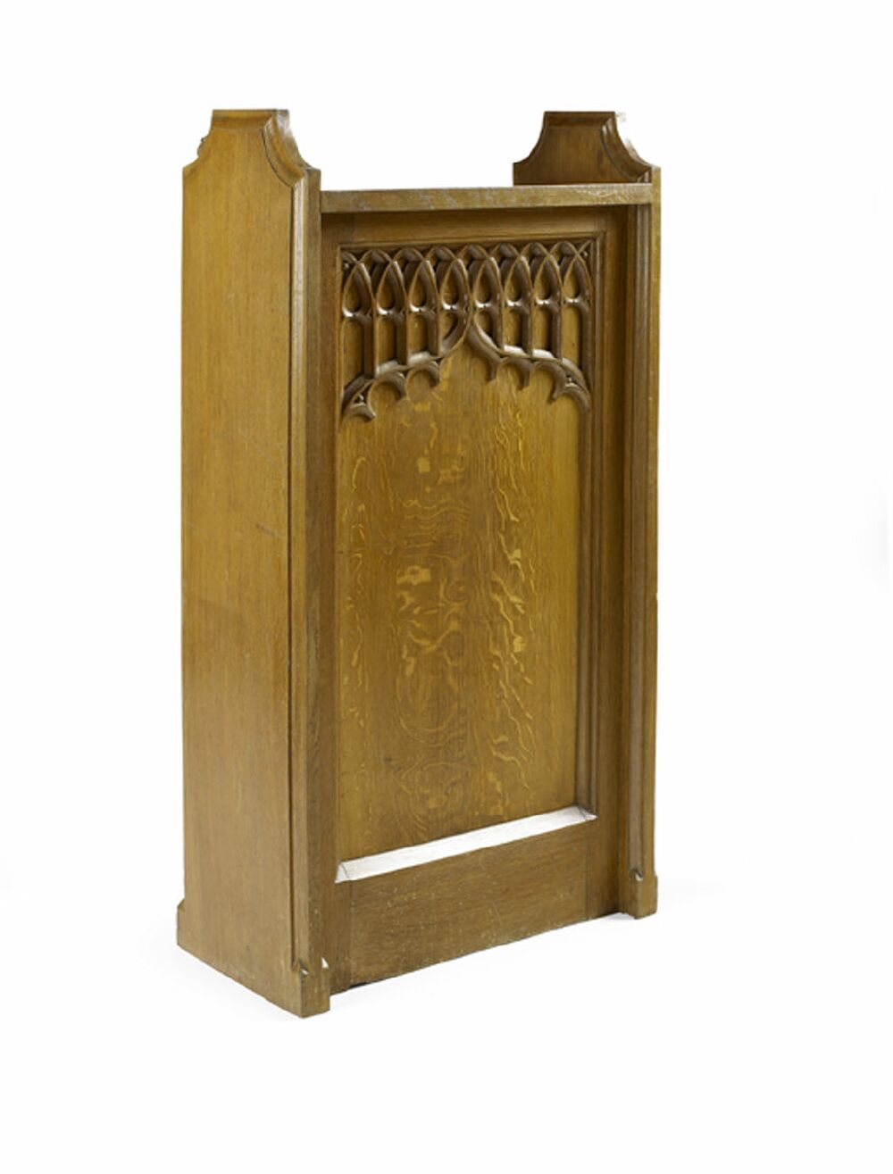 the panelled front with applied arch tracery, enclosed moulded pew end sided, the rear with two shelves, bears inset brass memorial plaque for Harold Irby Saville and his wife Margaret