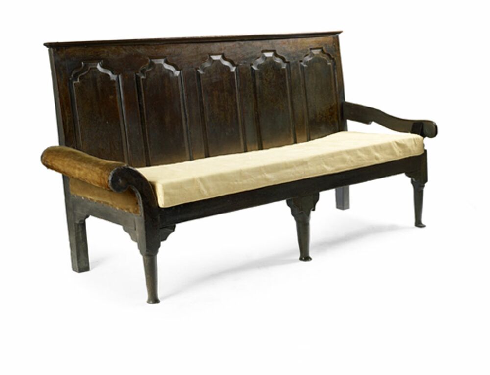 the quintuple ogee arch fielded panel back above a downswept arm and outcurved padded arm, seat formerly string, on tapered short circular legs