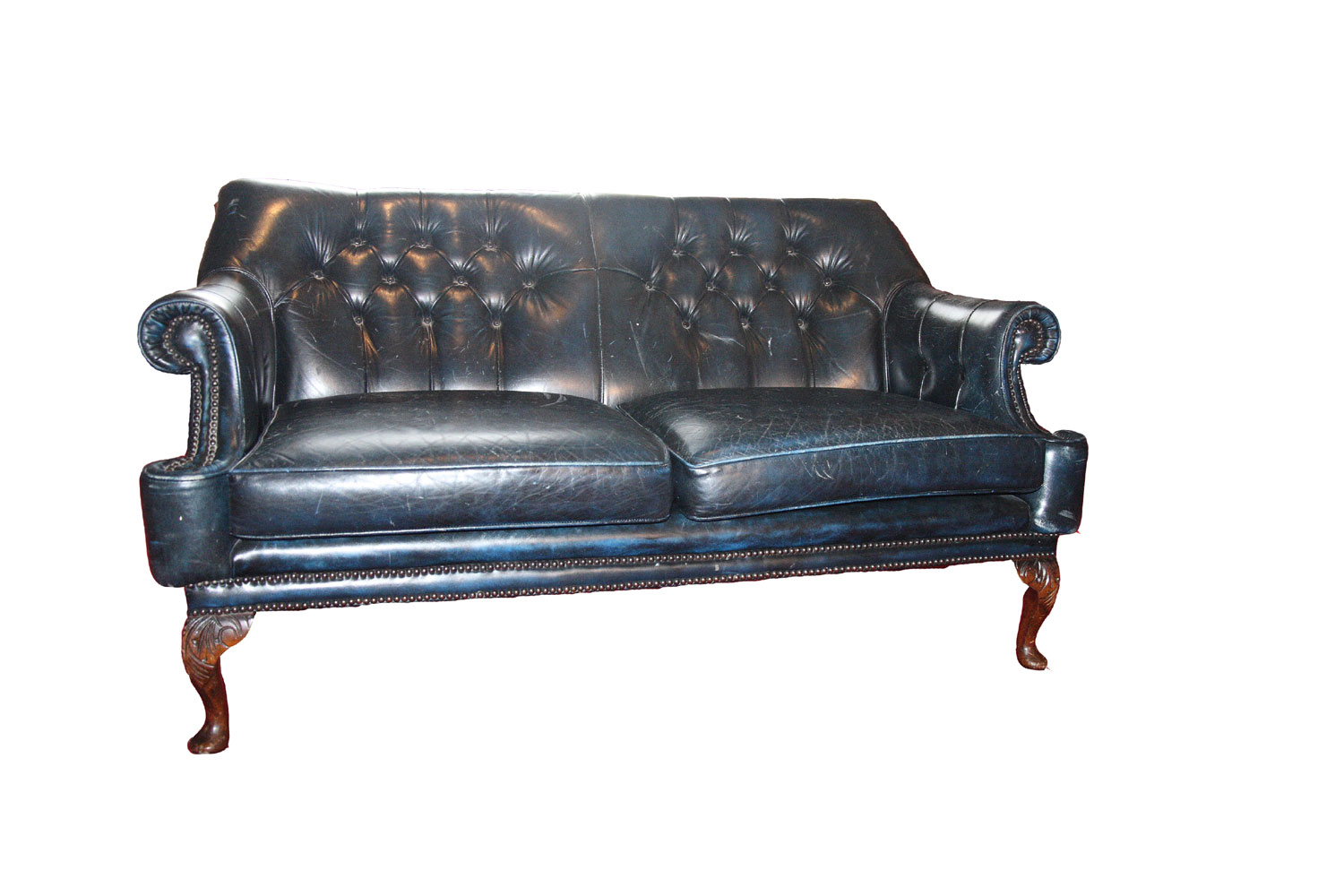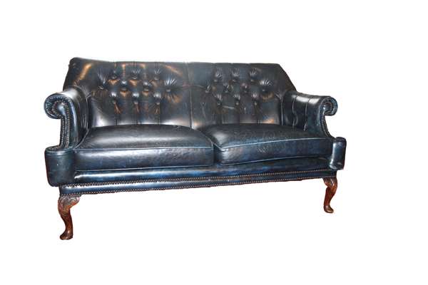 covered in dark blue buttoned leather, on leaf carved cabriole legs ending in pad feet