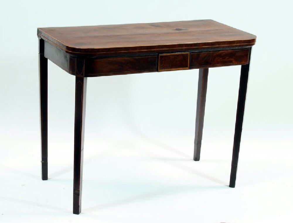 inlaid with stringing, the rounded rectangular top revealing a baize interior above a frieze with central burr yewwood tablet, on square tapered legs