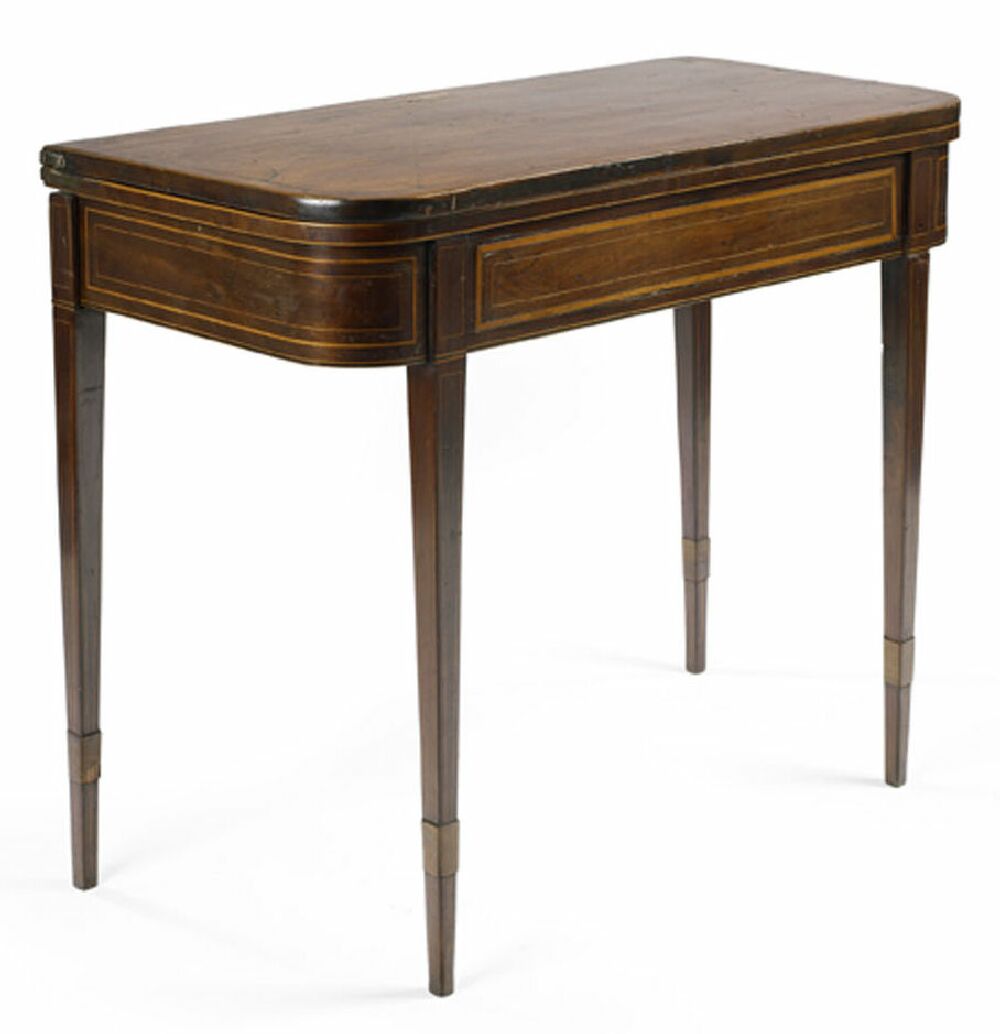 inlaid with stringing, the D-shaped foldover top with radial strung inlay, the satinwood banded frieze on square tapered legs