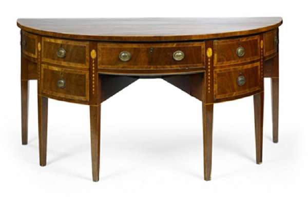 A George III period mahogany and kingwood crossbanded demi-lune sideboard