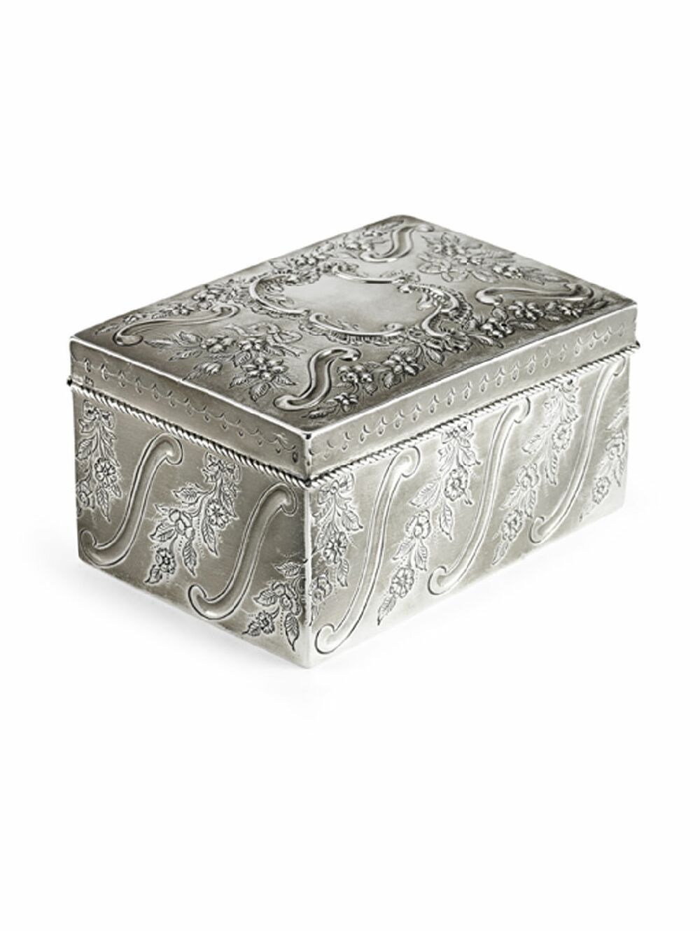 with marks for Amsterdam, of rectangular form, the sides flat chased with scroll and trailing flower garlands, the hinged lid with similar embossed design, the base with later inscription 'Lancelot Carnegie from........ January 2 1890'