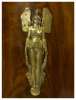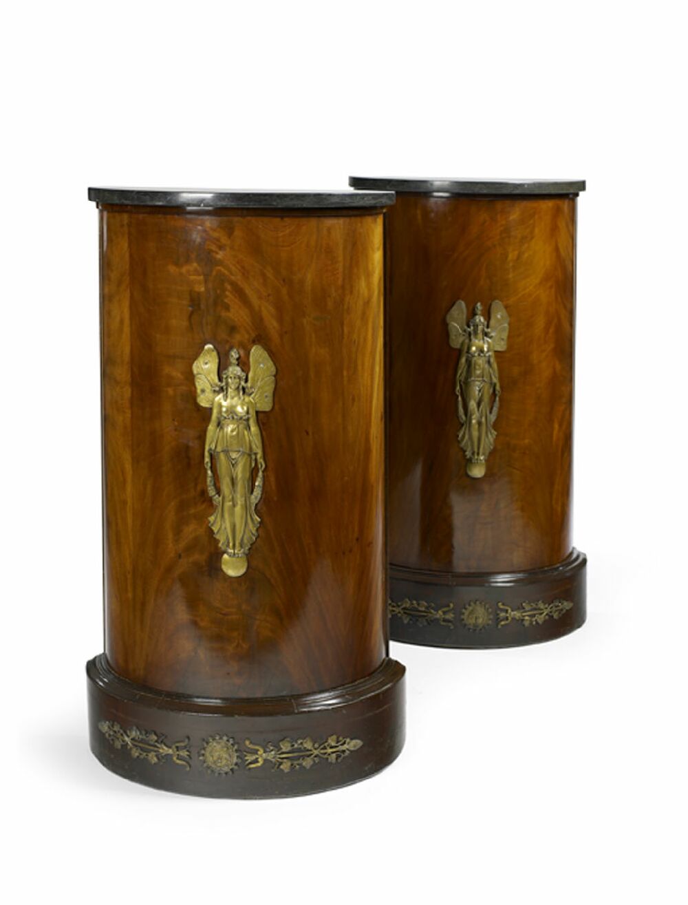 with block marble tops above triple flame veneered half columns with gilt bronze winged female mounts, the moulded outset plinths with mask and foliate motifs (backs replaced)