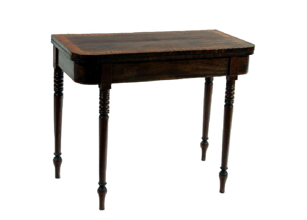 inlaid with chequer stringing, the rounded top revealing a baize lined interior, on ring turned tapered legs